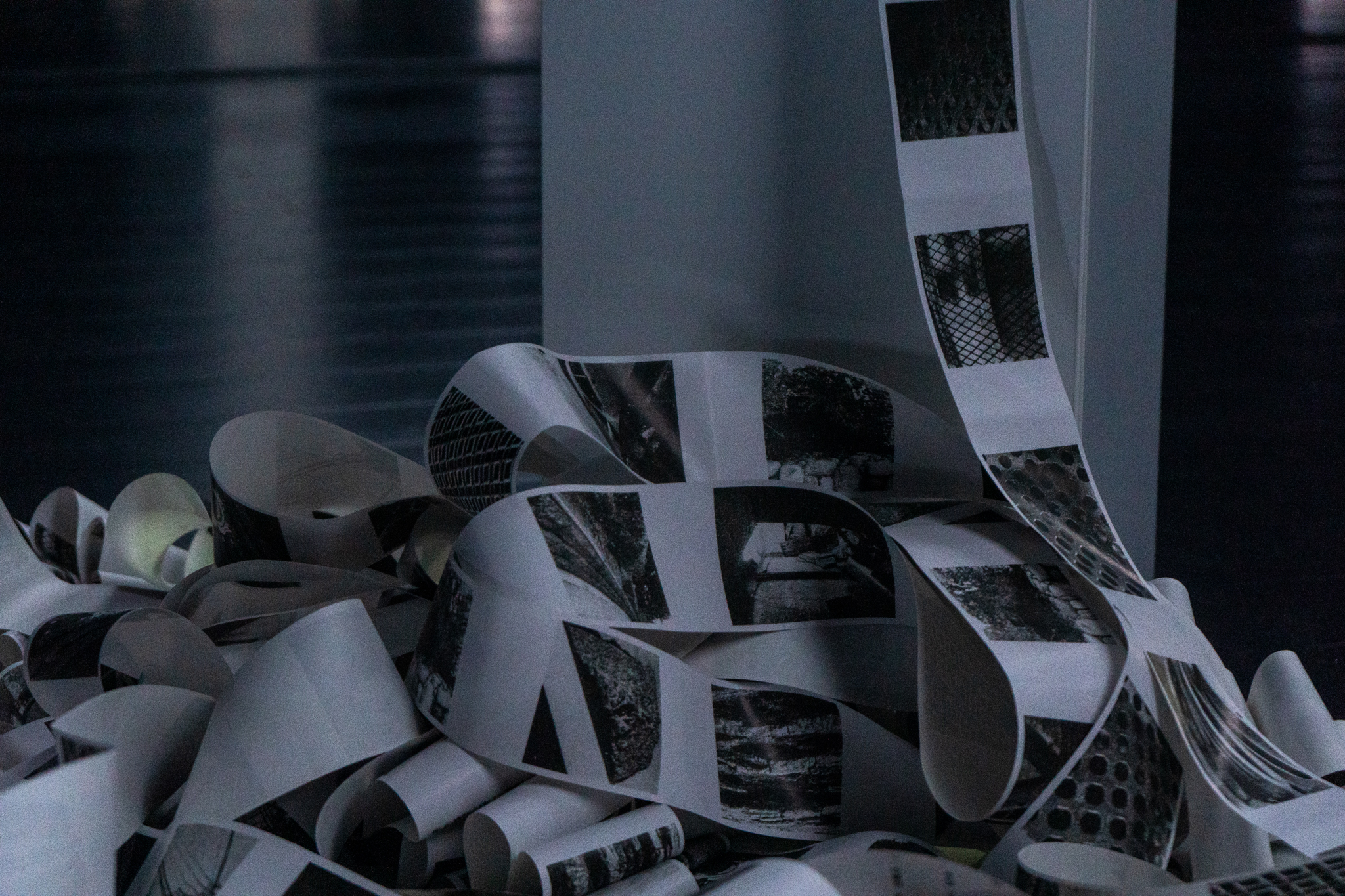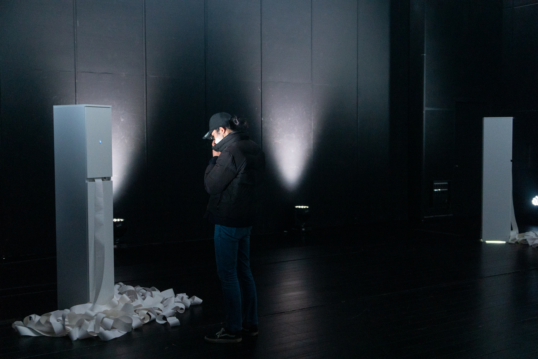 공간을 그야말로 ‘유령처럼’ 떠도는 관객들은, ‘void time’을 채우기 위한 시간을 가진다. 또는 이 공간을 주조하는 전시의 역량을 의미화하려 시도한다. 움직임과 이동을 통해서 시간을 공간화하거나 공간 안에 쌓이는 시간을 확인하며 공간을 시간화한다. 한편, 텍스트의 세계에서 남자와 여자로 특정된 어떤 일상의 시간은 고여 있다. 그 고임은 또 다른 고임으로 대체된다. 데이터의 끝없는 재현으로서 프로그래밍된 프린터는 ‘무한 출력’이라는 명령을 수행한다. 텍스트와 이미지의 무한한 반복—출력—은 더미라는 하나의 형식을 완성한다. 반복이라는 형식이 반복으로서의 내용을 갈음한다.