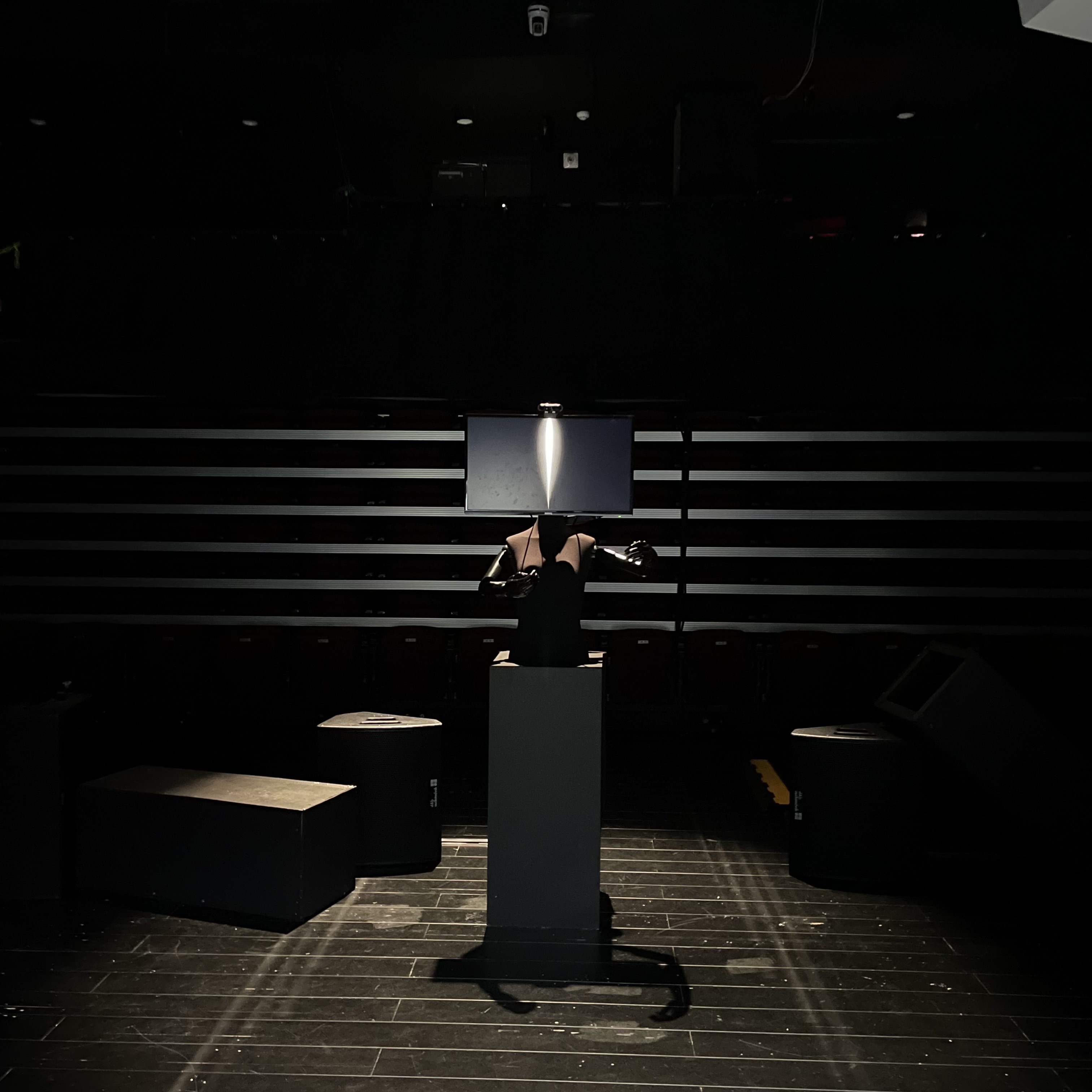 무대 입구와 가까운 곳에는 스피커들이 자리하는데 이 역시 냉장고—투박한 디자인의 1단 냉장고—와 형태적 유사성을 띤다. 스피커에서는 냉장고의 노이즈가 ‘새어 나온다.’ 이는 엄밀히 청각적 구문이 아닌 물질의 입체적 공명 효과를 의도하는 것으로 보인다. 노이즈는 물론 분명한 음가로 파악되는 대신 스피커와 그 주변으로 떨리고 있음의 물리적 현상으로 연장된다. 노이즈가 일종의 음악 구간을 형성하는 건 클라이맥스에 이르러서다. 그것이 공간 자체를 현상한다는 점에서, 독자적인 연주의 형식이 무대에 오른다고 할 수 있다. 물론 이러한 공연의 효과—공연임에 대한 인지—는 예외적인 순간이며, <DIOS>가 주창하는 듯한 일상의 잠재적 양식—돌아가는 냉장고와 같은 고정값의 소음—과 분명한 차이를 보인다.