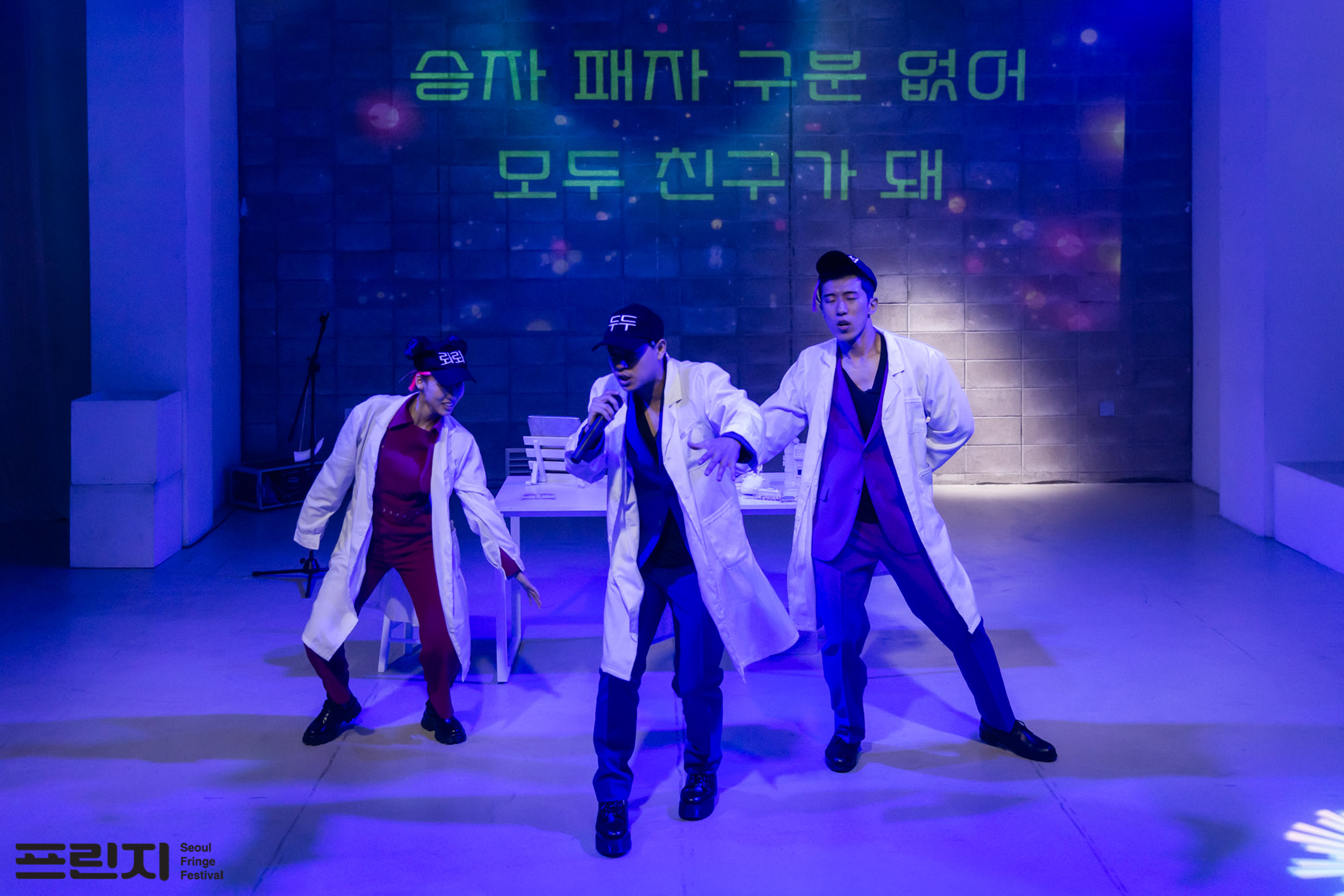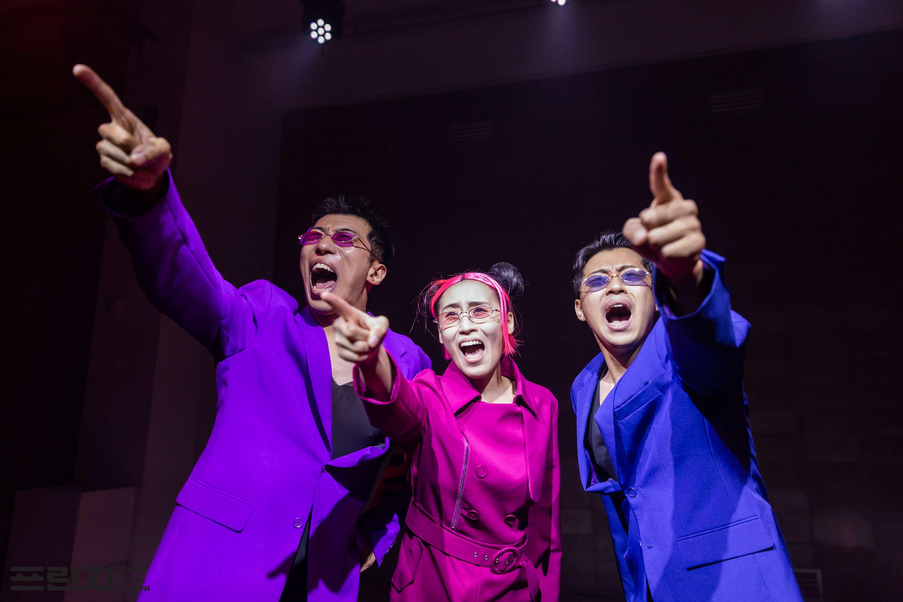 “와와? 와와와??” 우스꽝스러운 복장에 과장된 몸짓으로 알 수 없는 말을 하는 세 연기자는 “와”로 대화하더니 이정현 <와>에 맞춰 춤을 추기 시작한다. 이게 무슨 말도 안 되는 의식의 흐름인가 싶겠지만 이런 질주는 멈추지 않는다. 멈출 생각이 없다. 브레히트의 명으로, 프로젝트 뉴플래닛이 그리는 포스트 서사극은 세 배우의 엄청난 에너지를 바탕으로 끝 모르고 달려간다.